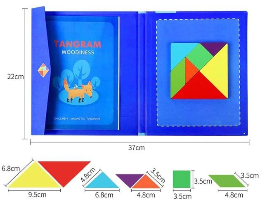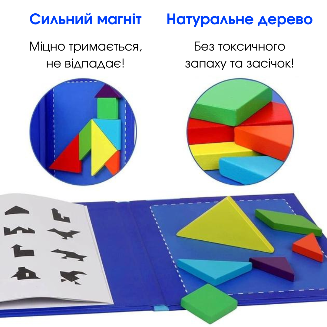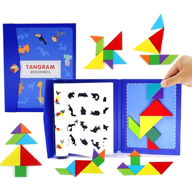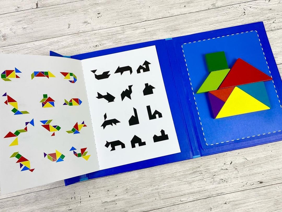 Дитині показують візуальне завдання скласти якийсь об’єкт, наприклад будинок. В наборі 7 геометричних деталей для виконання цієї задачі. Якщо виникають труднощі – в книзі із завданнями також зображені підказки. Якщо дитина старша – можна гратись на час. Магнітний танграм відмінно підходить для самостійної гри. Також зручно брати в дорогу або кафе, оскільки головоломка компактна, виглядає, як книга. Вона чудово може відволікти, коли дитині нудно.